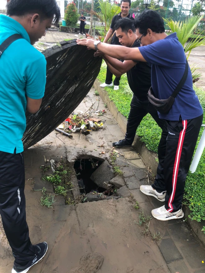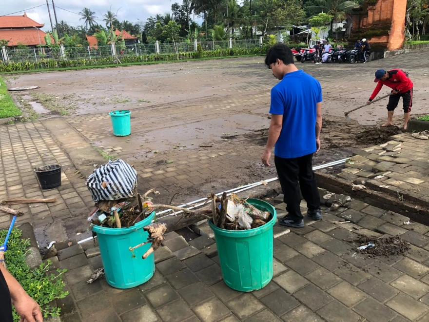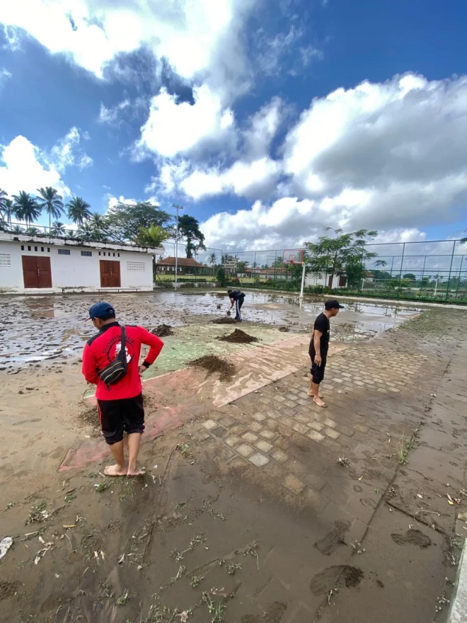 Kegiatan kebersihan dilakukan secara gotong royong oleh perangkat desa bersama staf, dengan menyapu, membersihkan genangan, dan mengangkat lumpur yang menutupi permukaan lapangan. Langkah ini dilakukan agar sarana olahraga yang ada dapat kembali digunakan masyarakat dengan nyaman.
