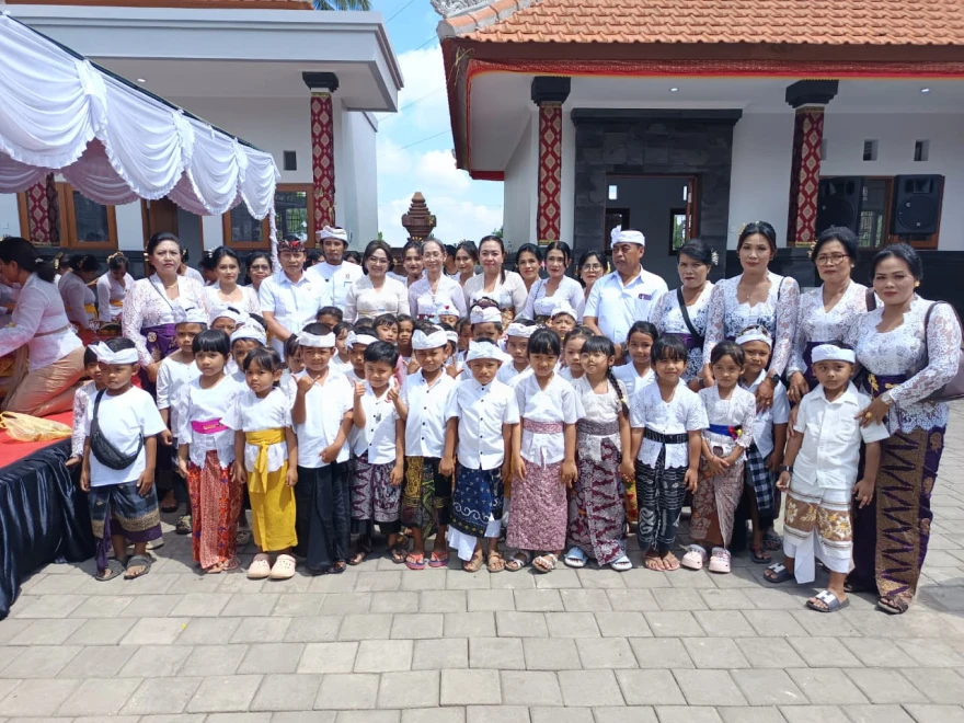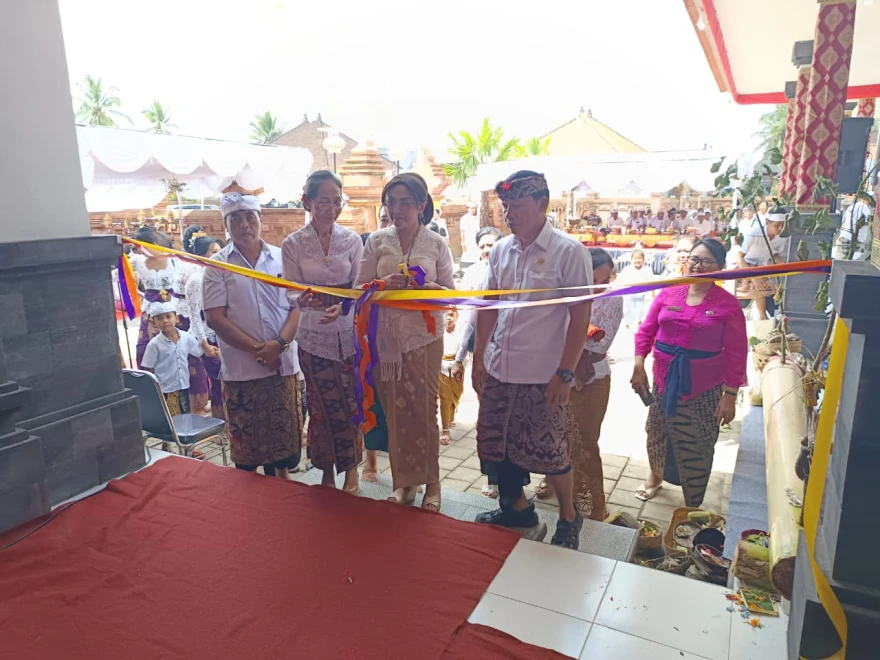 Bunda PAUD Kabupaten Badung, Nyonya Rasniathi Adi Arnawa, menghadiri rangkaian Karya Melaspas dan Ngenteg Linggih sekaligus meresmikan gedung baru TK Kumara Ngurah Rai I, Desa Carangsari, Kecamatan Petang, Kamis (16/4). Peresmian ditandai dengan prosesi pemotongan pita sebagai simbol dimulainya pemanfaatan gedung baru tersebut.